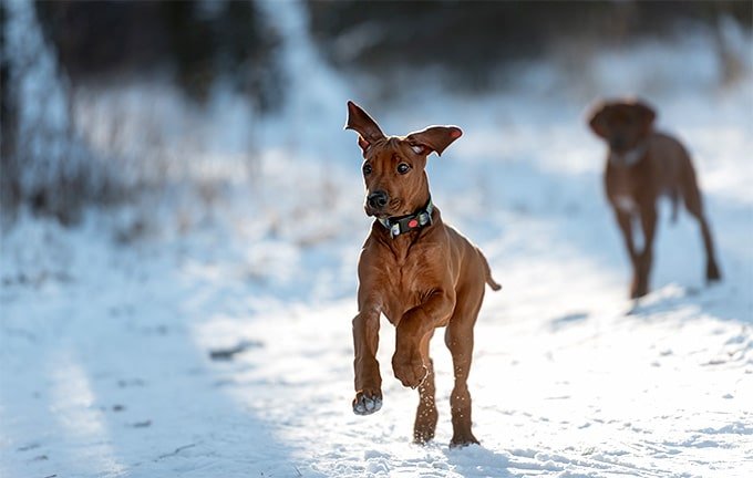 Mantenga a su Ridgeback en buena forma midiendo su comida y dándosela dos veces al día en lugar de dejarla fuera todo el tiempo. Si no está seguro de si tiene sobrepeso, hágale la prueba del ojo y de la mano. Primero, míralo. Deberías poder ver su cintura. A continuación, pon tus manos en su espalda, con los pulgares a lo largo de la columna vertebral y los dedos extendidos hacia abajo. Deberías poder sentir pero no ver sus costillas sin tener que presionar con fuerza. Si no puede, necesita menos comida y más ejercicio.