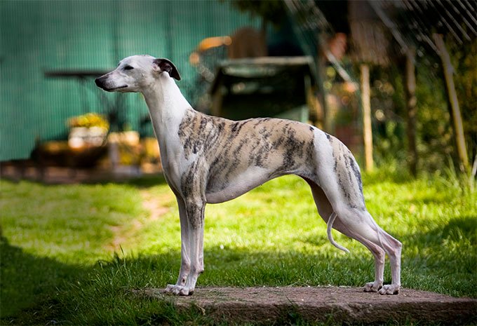 Este sabueso de tamaño medio tiene un pelaje corto y denso en una variedad de colores y marcas que cubren un cuerpo aerodinámico. El Whippet no es un galgo en miniatura, sino que se desarrolló cruzando galgos con terriers más pequeños y, más tarde, con galgos italianos. El resultado fue un perro elegante y bello que es suave y cariñoso.